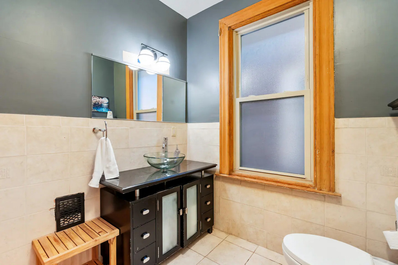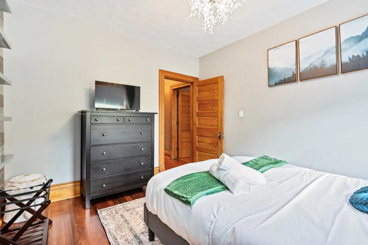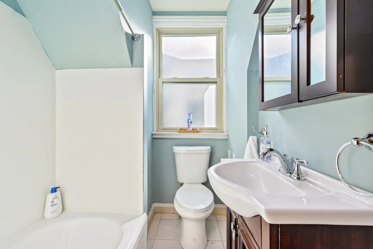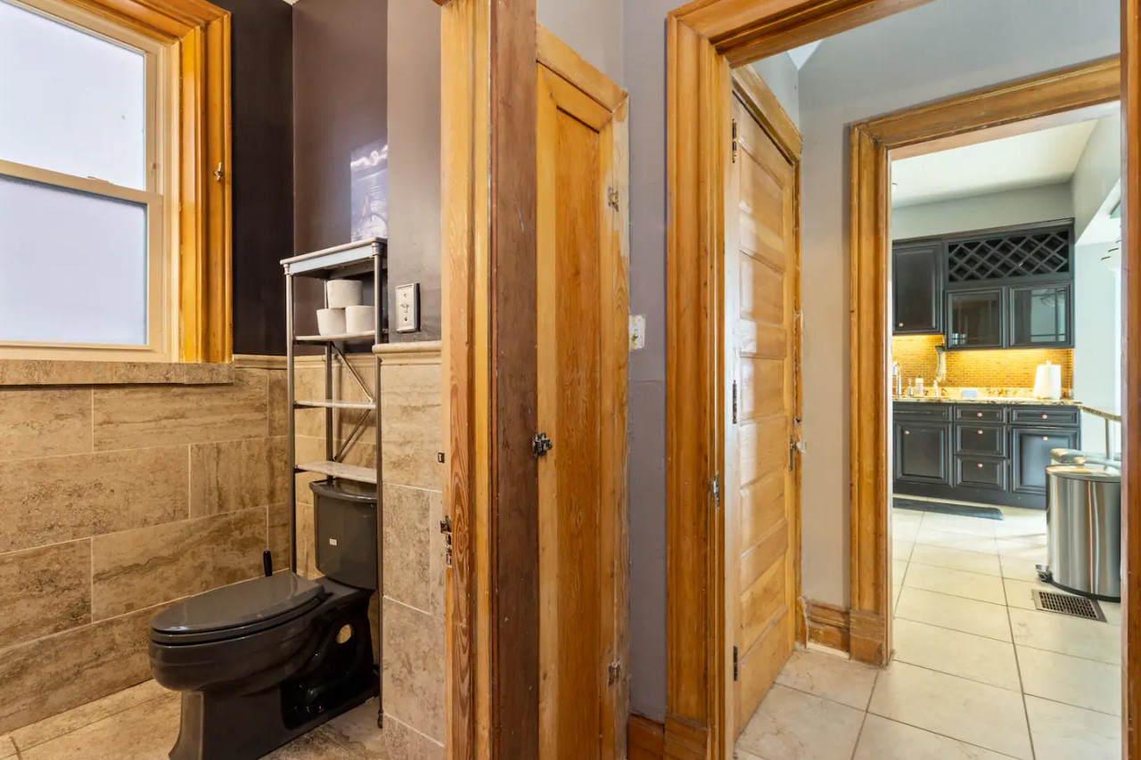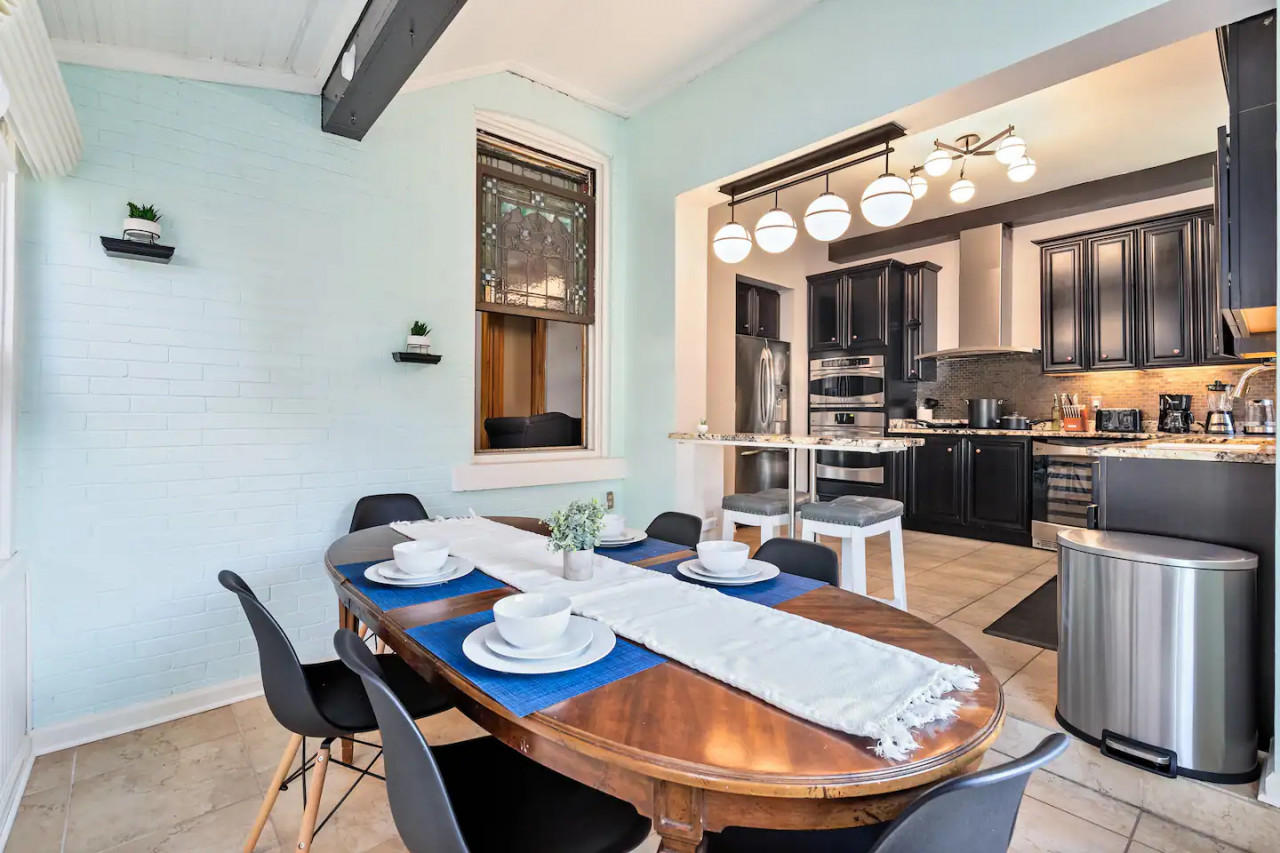 Enter through the front door with a smart lock and step into a home that blends comfort with vintage character. To your right is a dining area that seats up to 8, fully stocked with everything you need. Past the dining room, the inviting living room features a large wall-mounted smart TV and a comfortable sofa, making it the perfect place to relax or enjoy family time. The fully remodeled kitchen has brand-new appliances including a fridge, dishwasher, induction stove, oven, and microwave, plus a blender, toaster, and coffee maker. There’s also a charming breakfast nook for casual meals. Step out from the kitchen into a shared backyard that is connected to the parking garage. A convenient half bathroom is also located on this floor.