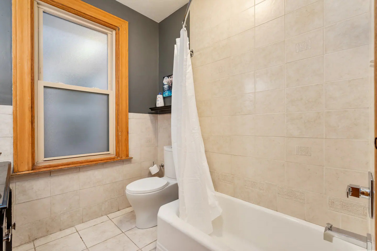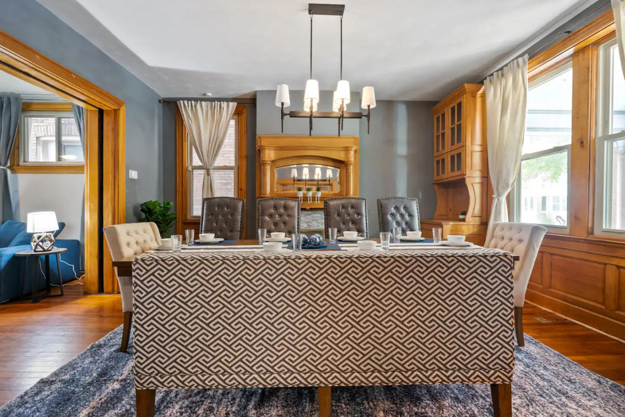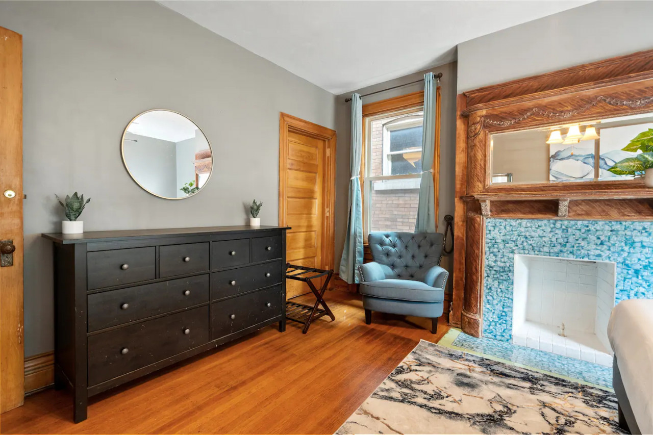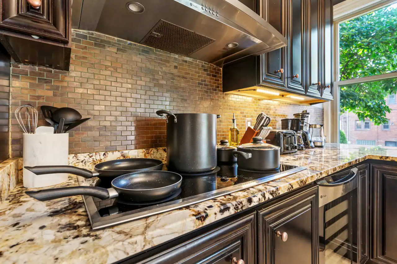 Enter through the front door with a smart lock and step into a home that blends comfort with vintage character. To your right is a dining area that seats up to 8, fully stocked with everything you need. Past the dining room, the inviting living room features a large wall-mounted smart TV and a comfortable sofa, making it the perfect place to relax or enjoy family time. The fully remodeled kitchen has brand-new appliances including a fridge, dishwasher, induction stove, oven, and microwave, plus a blender, toaster, and coffee maker. There’s also a charming breakfast nook for casual meals. Step out from the kitchen into a shared backyard that is connected to the parking garage. A convenient half bathroom is also located on this floor.