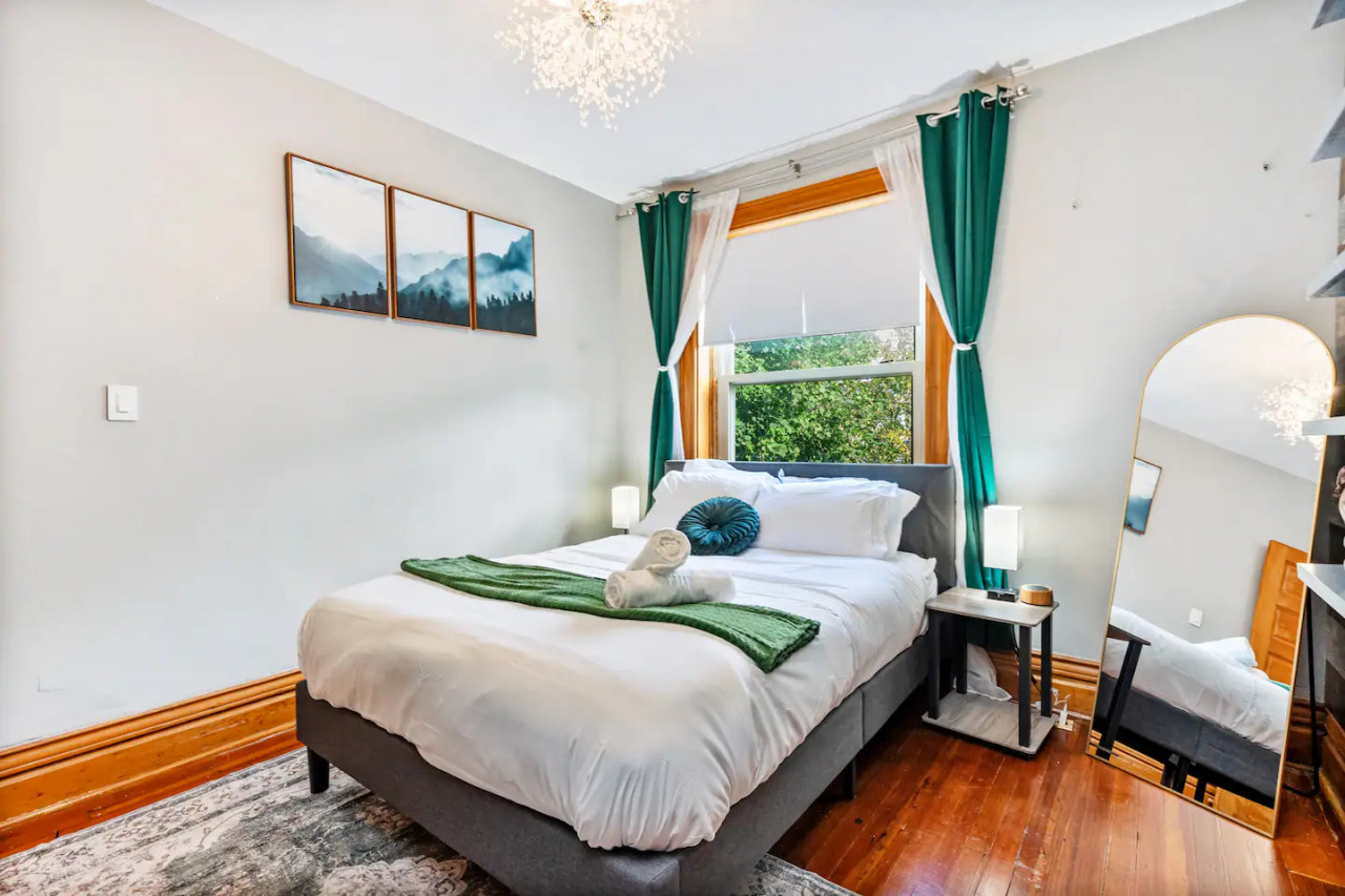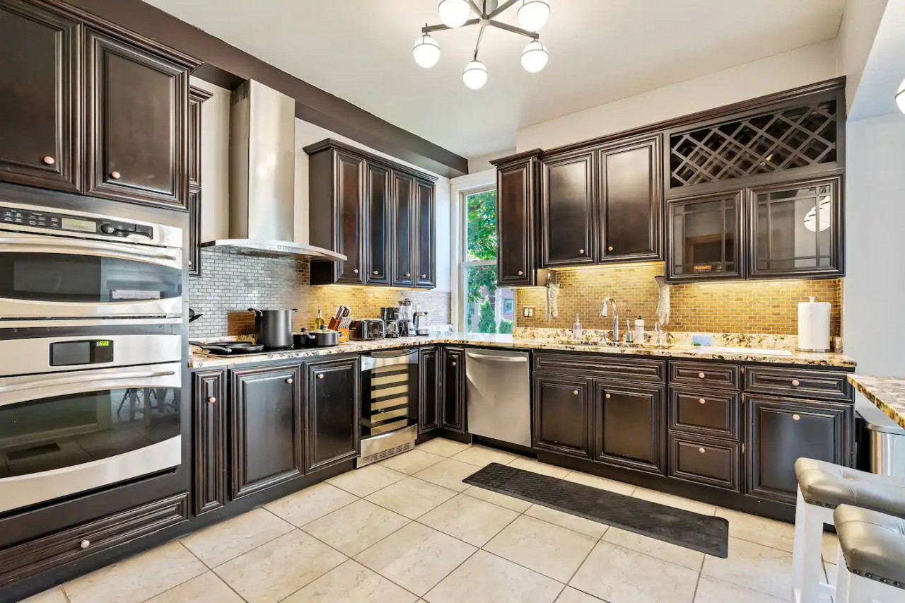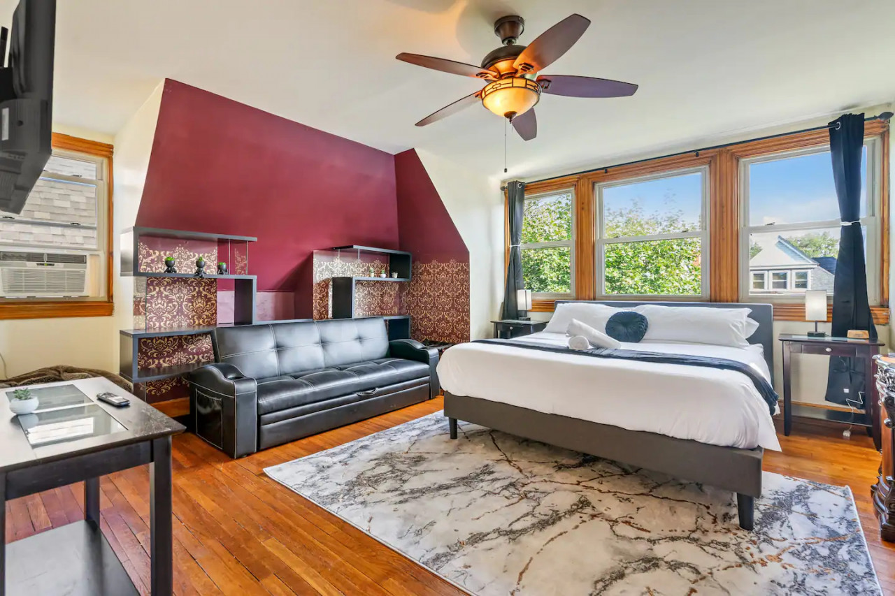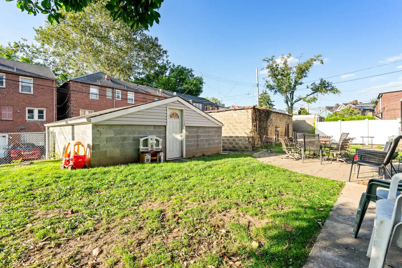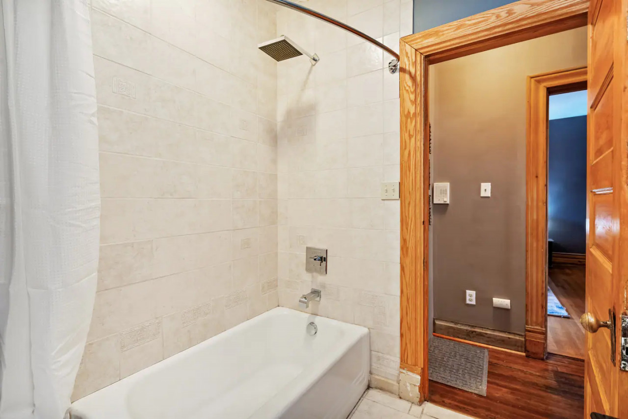 Enter through the front door with a smart lock and step into a home that blends comfort with vintage character. To your right is a dining area that seats up to 8, fully stocked with everything you need. Past the dining room, the inviting living room features a large wall-mounted smart TV and a comfortable sofa, making it the perfect place to relax or enjoy family time. The fully remodeled kitchen has brand-new appliances including a fridge, dishwasher, induction stove, oven, and microwave, plus a blender, toaster, and coffee maker. There’s also a charming breakfast nook for casual meals. Step out from the kitchen into a shared backyard that is connected to the parking garage. A convenient half bathroom is also located on this floor.