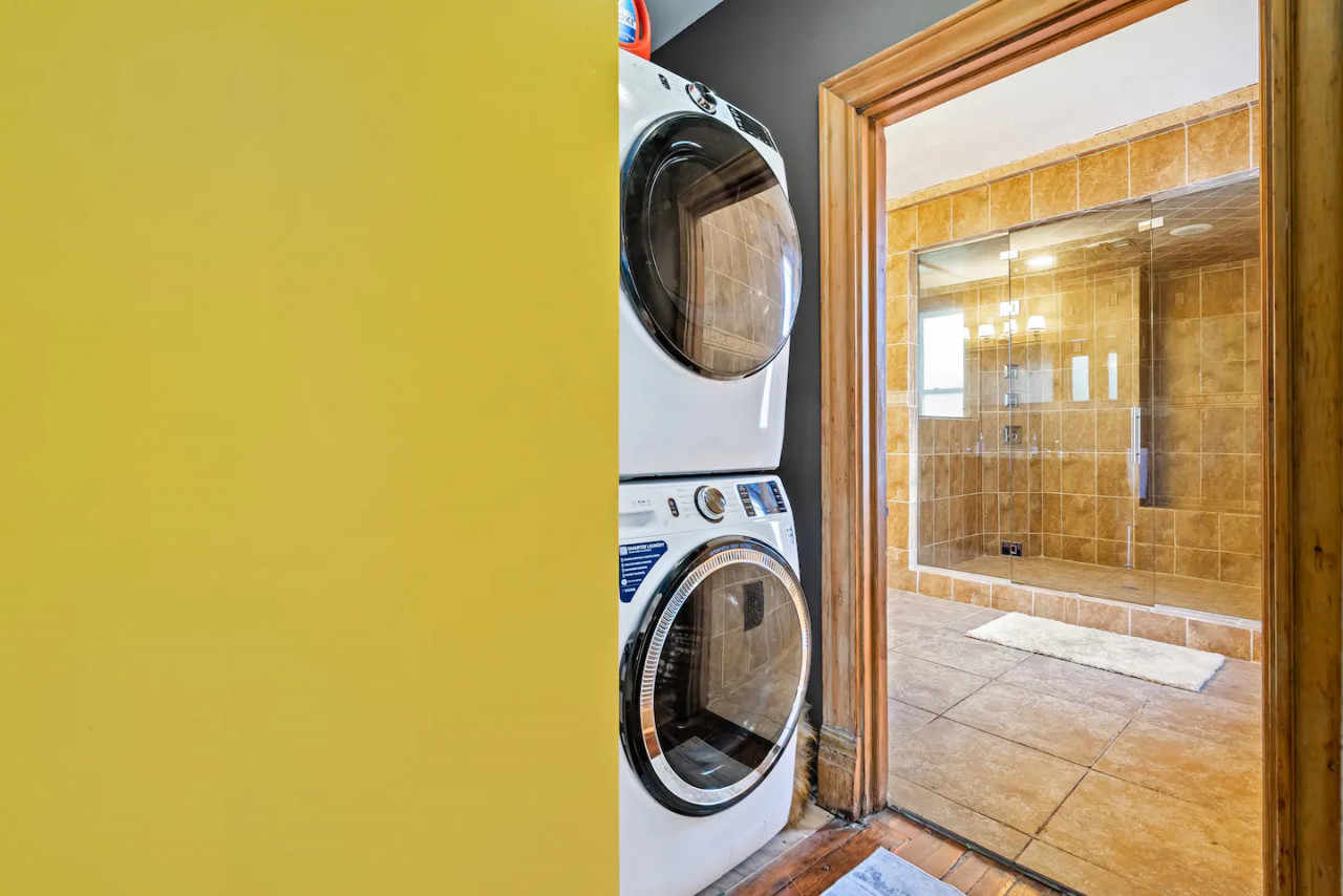The second floor includes three bedrooms and two full bathrooms. One bedroom has a queen-sized bed with a dresser and smart TV. Another has a king-sized bed and dresser. The master bedroom offers a king bed, dresser, smart TV, and en suite laundry. The first full bathroom features a rainfall showerhead over the tub and a modern vanity. The master bathroom includes a luxurious walk-in spa steam shower, double sinks, and updated finishes, creating a true spa-like retreat.