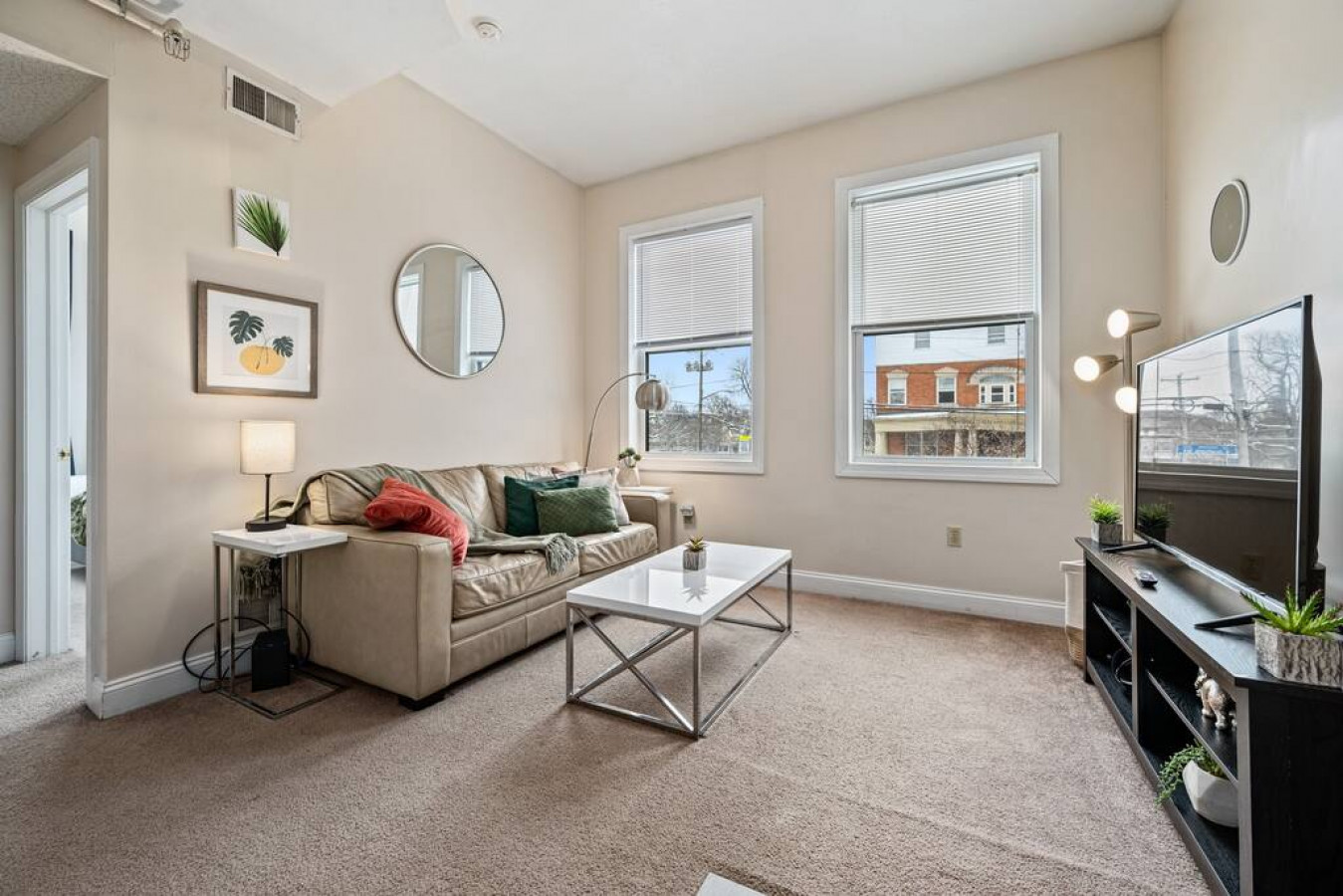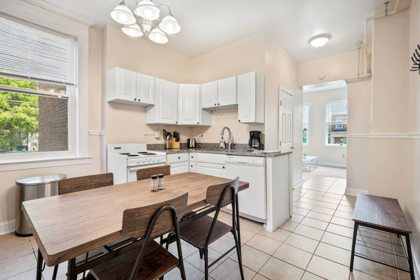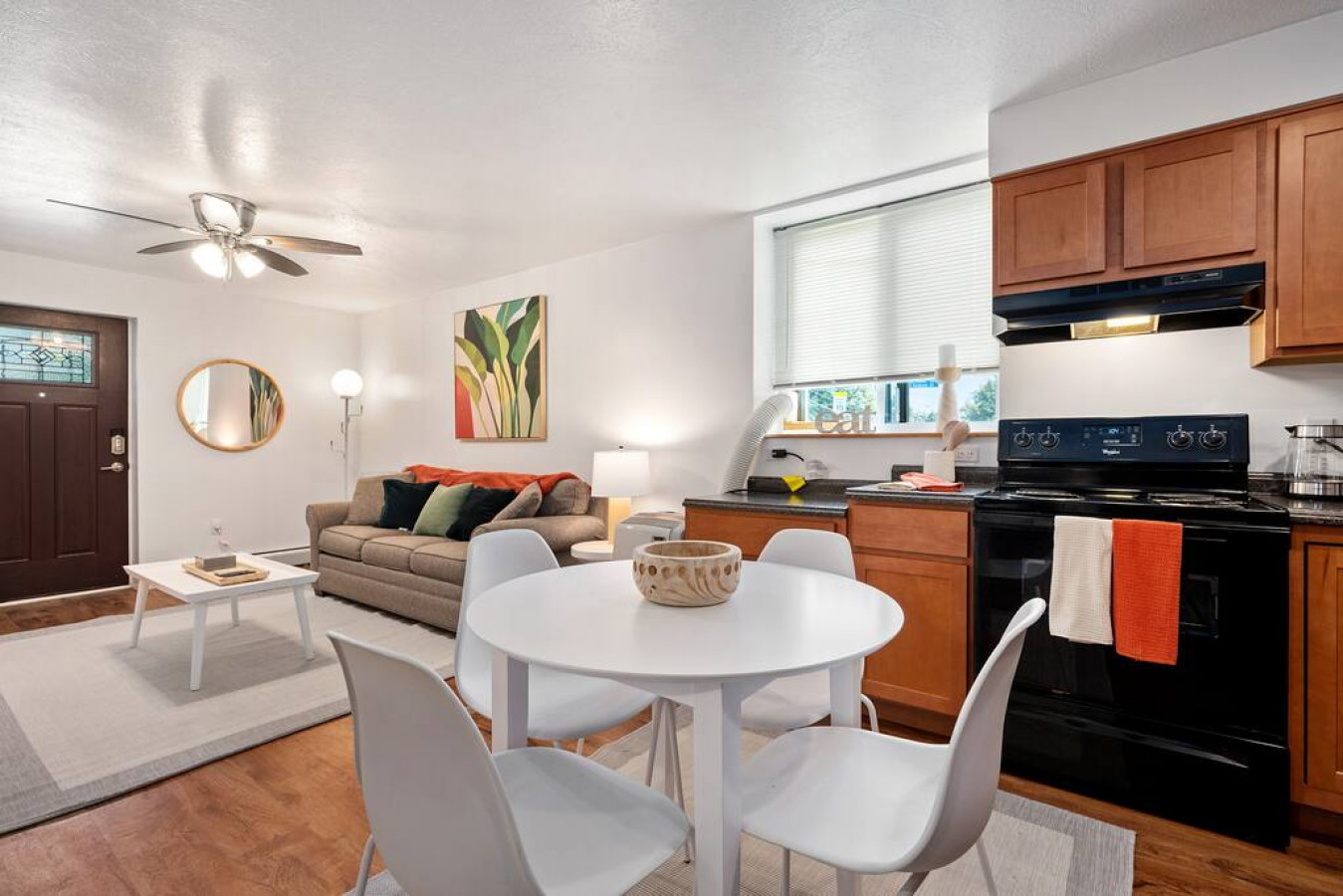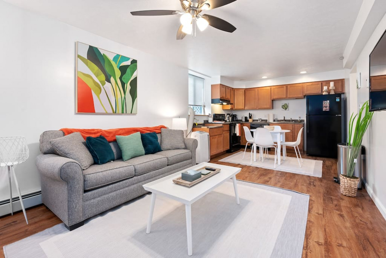 Similar to the first apartment, once you enter you will walk into the living room area. There is a comfy sofa that pulls out into a queen sized sofa bed at the center of the living room with a 43" TCL Roku TV mounted as well for unwinding. To the left of the couch is a four seater dining table right next to the kitchen!