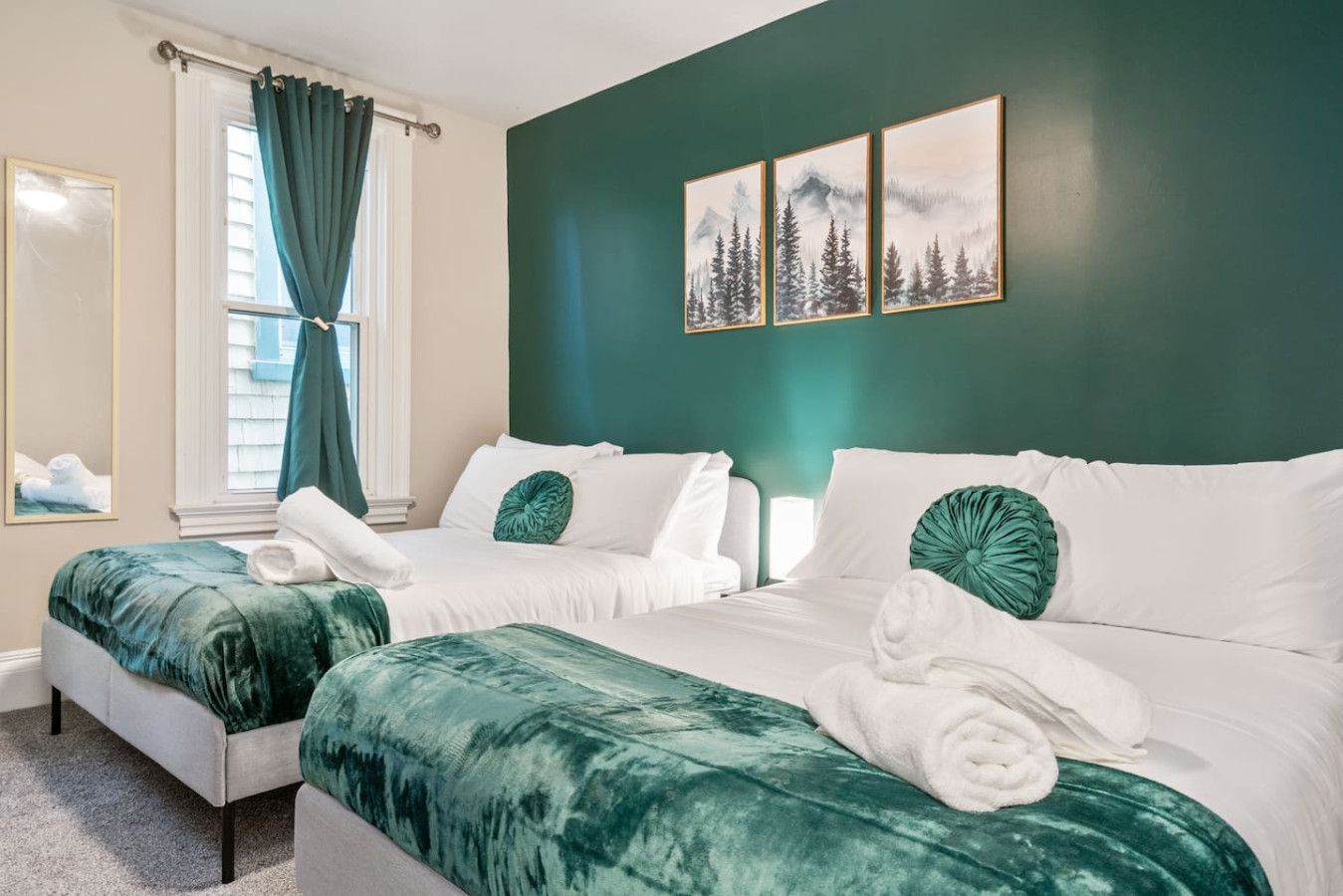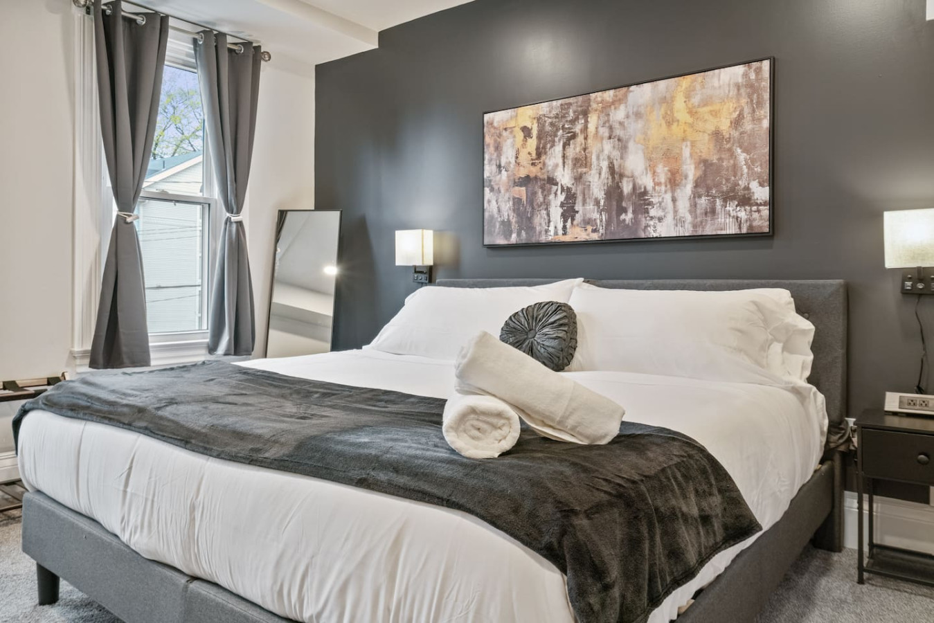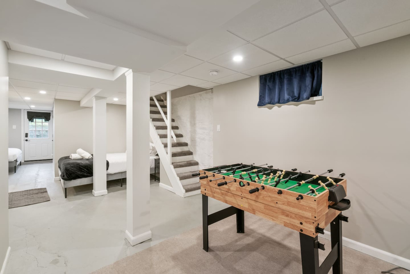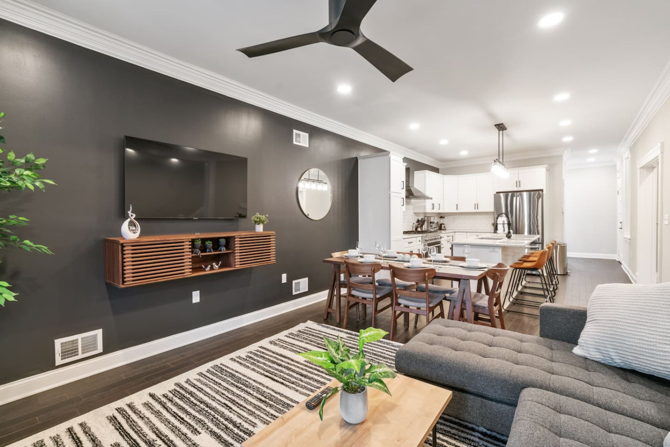 / nightWelcome to our stunning 4-story home in Shadyside! This home is huge with 4 BRs + a finished basement along with 3.5 baths, perfectly located right next to UPMC Shadyside Hospital. Also a short walk from Giant Eagle Market District! ⭐7 beds with memory foam mattresses (3 King / 1 Queen/ 3 Full) ⭐Private backyard ⭐1 rollaway bed + 1 crib + 2 sleeper sofas ⭐Washer/ dryer ⭐Street parking (Paid options nearby) My team and I are here for you 24/7 before, during and after your stay with us! Welcome to your perfect Pittsburgh retreat — a spacious 5-bedroom, 3.5-bathroom home that comfortably sleeps 12 guests across four beautifully designed floors. Ideal for large families, friend groups, or corporate stays, this home combines comfort, convenience, and thoughtful amenities in one of the city’s most walkable neighborhood. Nestled just a short walk away from Giant Eagle Market District and Walnut Street’s restaurants and cafes, you'll enjoy easy access to groceries, coffee shops, and entertainment. UPMC and several universities (CMU, Pitt, Chatham) are also a short drive away. First Floor: Step into comfort and convenience on the beautifully designed first floor of this inviting home. The open-concept layout seamlessly connects the living room, dining area, and fully stocked kitchen—creating the perfect space to gather, relax, and enjoy your stay. Living and Dining Area: Unwind in the cozy living area featuring two plush sofas (one converts into a queen-sized pull-out bed), a large smart TV for streaming your favorite shows, and a 6-seater dining table ideal for shared meals or game nights. Kitchen: The kitchen is a cook’s delight, complete with a 4-seat breakfast bar, modern appliances, and all the essentials you need to whip up anything from a quick breakfast to a full dinner. Convenient amenities include a half bathroom, in-unit laundry with a free washer and dryer, and access to both a charming furnished front porch and a partially fenced backyard. Second Floor: Head up the stairwell just off the living room to the second floor, where you'll find three inviting bedrooms and a full bathroom—creating a comfortable and private space for rest and relaxation. Full Bathroom: This shared bathroom features a combination tub and shower, perfect for soaking or a quick rinse. Stocked with bathroom essential, it offers everything you need to start or end your day feeling refreshed. Bedroom 1 – The Blue Room: A calming retreat with a king-size bed, 6-drawer dresser, 43” Smart TV, and a closet. Ideal for unwinding in comfort after a busy day. Bedroom 2 – The Green Room: This versatile space includes two full-size beds, a 3-drawer dresser, a 43” Smart TV, and a closet—perfect for kids, friends, or extra guests. Bedroom 3 – The Charcoal Room: The most spacious of the three, this room features a king-size bed, 8-drawer dresser, 43” Smart TV, full-length mirror, armchair, and a large closet. It also includes a writing desk and chair, as well as a twin rollaway bed, making it perfect for longer stays or guests needing extra room to spread out. Third Floor: The luxurious top floor is dedicated entirely to the Primary Suite, offering a private, elevated retreat perfect for relaxation or remote work in total comfort. Bedroom 4 – Primary Suite: This spacious and serene suite features a king-size bed and a sectional sofa that converts into a queen-size sleeper—ideal for families or extra guests. A large electric standing desk provides a dedicated workspace, while a 3-drawer dresser and 43” Smart TV add to the room’s functionality and comfort. Whether you're catching up on rest or checking in on work, this space is designed to accommodate it all. En Suite Bathroom: Step into a spa-like experience with a stunning ensuite bathroom that features a double vanity, expansive layout, and a luxurious walk-in shower with multiple shower heads. It’s the perfect way to start your morning or unwind at the end of the day. Basement: The lower level of the home offers a quiet and private retreat, perfect for guests seeking a bit of extra space and privacy. This thoughtfully arranged area includes a queen bed and a full bed, comfortably accommodating multiple guests. A full bathroom on this level adds convenience, while a full-size dresser provides plenty of storage for longer stays. A dedicated desk creates a comfortable workspace, and a foosball table adds a playful touch—great for winding down after a busy day. Parking: Street parking is available with required registration through the city. While parking in the area can be tight at times, we’re happy to offer information on nearby paid overflow parking options for added convenience.