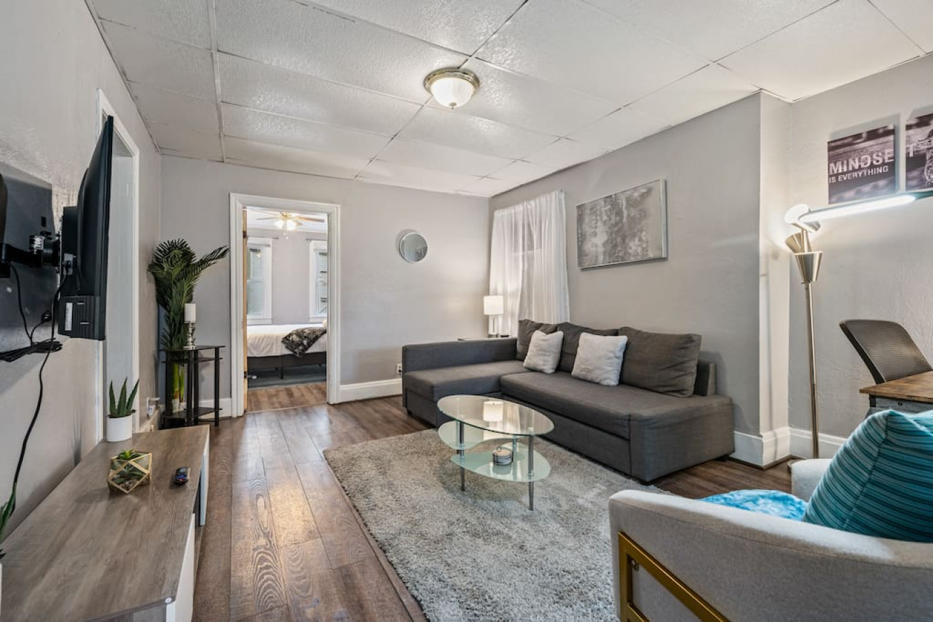 The Living Room: A great space for bonding. There is a cozy sofa centered in the living room that folds out to a Queen sized sofa bed. Centered in the living room is a 43" TCL Roku Smart TV so you can log into your favorite subscriptions and watch TV during your stay. For any business needs, there is a desk on the right of the living room with all business essentials.