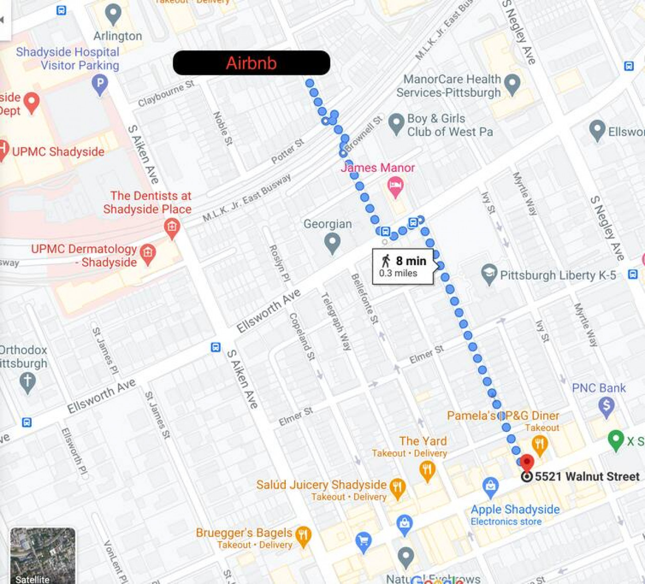 The place was great. Everything was as pictured. the bed was really comfortable. Lots of groceries, restaurants, and cafes near there. We went all over Pittsburgh from there, by bus one day ($7 day pass highly recommended), and one day by ebike (rented by jiggers Cafe). I really like the Korean restaurant just 2.5 blocks up the road from there on Centre.