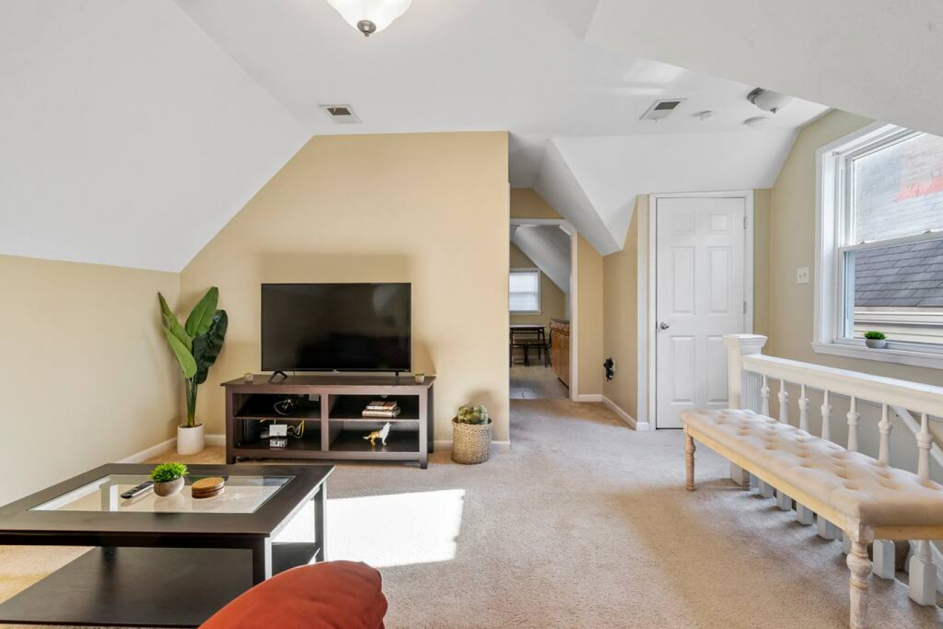We stayed an enjoyable 2 weeks in this very pleasant apartment in May. The kitchen was well appointed and opens to a small outdoor deck. Living room was comfortable with large screen TV with Roku. The bedroom had a very large bed that was very comfortable and a desk. Pretty quiet building with 2 other rentals. We used the washer/dryer in the basement which worked well. (Bring quarters) You will get some good exercise with the stairs, as this is a 3rd floor unit. Thanks Jake!