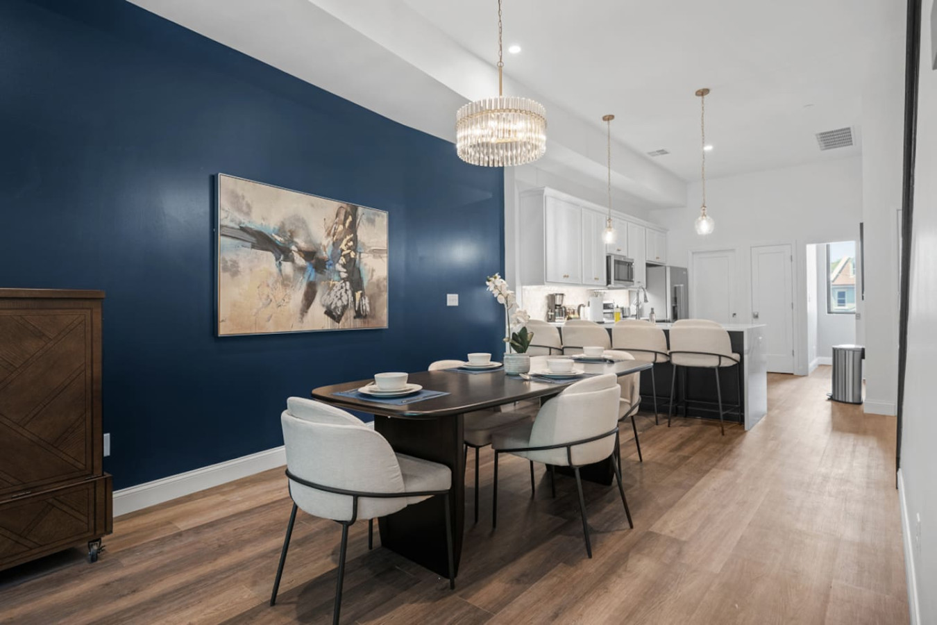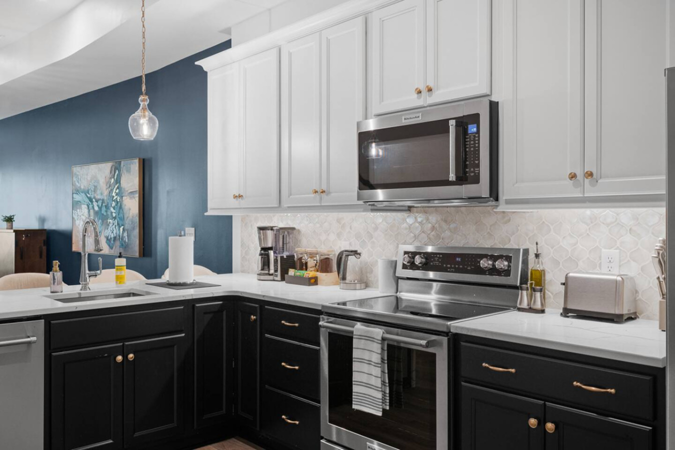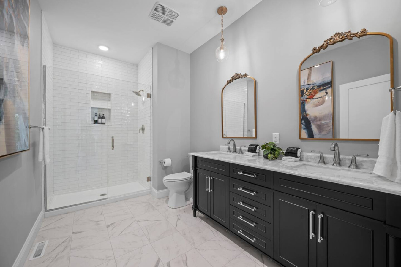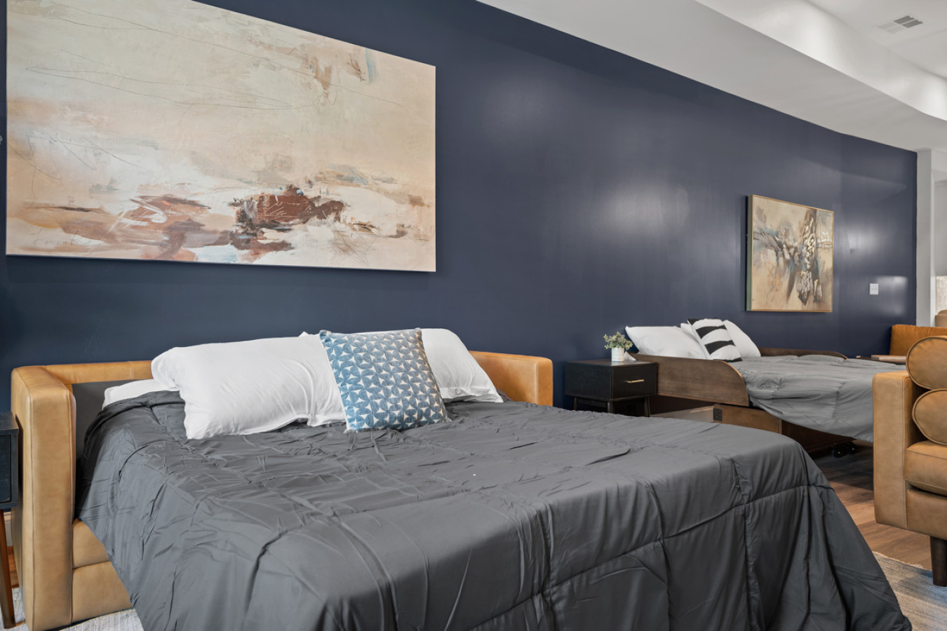 / nightEnjoy our immaculate 2 BR Penthouse suite on Butler Street, right in the heart of Lawrenceville. This is a brand new construction building in 2025. Just steps away from several local shops, cafes, and dining options in one of Pittsburgh’s most vibrant neighborhoods. ⭐2 King Beds (memory foam mattresses) ⭐1 Queen Sleeper sofa + 1 Queen Murphy Bed + Pack N Play ⭐Rooftop Deck w/ City view ⭐Free in-unit washer/dryer ⭐Free off-street parking ⭐Desk with speedy wifi ⭐24/7 guest support Please note: This apartment is accessible only by stairs. You’ll need to climb two full flights, and there is no elevator in the building. Welcome to our immaculate 2-bedroom penthouse suite, nestled on vibrant Butler Street in the heart of Lawrenceville. This brand-new 2025 construction offers contemporary amenities and is just steps away from some of Pittsburgh’s most renowned establishments. Explore the vibrant Lawrenceville neighborhood with Parlor Dim Sum, The Abbey on Butler Street, and La Grassa Pizza just a short walk away. Catch a film at Row House Cinema, bowl at Arsenal Bowl, or visit the Roberto Clemente Museum—all within minutes. Allegheny Cemetery and Doughboy Square are also nearby, offering a glimpse into Pittsburgh’s rich history. Kitchen Area: As soon as you enter, you’ll be greeted by the open floor layout. To your left, you’ll find the fully equipped kitchen, featuring brand-new stainless steel appliances and ample countertop space for all your cooking needs. With plenty of cabinets and drawers, you’ll have plenty of storage for your essentials. The kitchen is equipped with a coffee maker, electric kettle, and other kitchen gadgets to make meal prep easy. There’s also a cozy 4-seater nook, perfect for enjoying meals or a cup of tea or coffee. Next to the kitchen, you’ll find a convenient half bath, adding an extra layer of comfort and convenience to the space. Dining Area: Next to the kitchen, you’ll find the dining area, featuring a 4-seater table perfect for meals with family or friends. It’s fully equipped with all the dining essentials, including plates, bowls, utensils, and glassware, making it easy to enjoy home-cooked meals. Living Area: Just beyond the dining area is the inviting living room, featuring two large sofas—one facing a big smart TV for easy viewing, and the other arranged for casual conversation. One of the sofas conveniently converts into a sleeper sofa for additional sleeping arrangements. There’s also a queen-sized Murphy bed in the living area for added comfort. A cozy single chair offers an extra spot to relax. Step out from the living area onto the deck, where comfortable seating invites you to enjoy the sun or unwind with a cup of coffee. Let’s head upstairs to the next level of this stunning space! Bedroom 1: Upstairs, you’ll find the first bedroom featuring a king-sized bed with a plush memory foam mattress. Bathed in natural light from a large glass window, this elegant space offers a cozy and refined retreat. A wall-mounted smart TV is positioned directly across from the bed for effortless entertainment. You’ll find ample storage with a spacious closet and dresser, along with a dedicated desk perfect for work or study. The en suite bathroom adds to the luxury, featuring a sleek standing shower with a premium showerhead, dual vanity sinks with stylish mirrors, and all the essentials—including shampoo, conditioner, and body wash. Hallway: Leaving the first bedroom and walking across the hallway, you’ll find a dedicated study nook with a desk—perfect for working or studying in peace. Just steps away is the laundry room, complete with an in-unit washer and dryer for added convenience during your stay. Bedroom 2: At the end of the hallway, you’ll find the second bedroom, featuring a king-sized bed with a plush memory foam mattress. This elegant and beautifully designed room is filled with natural light from a large window and offers ample storage with a spacious closet. The en suite bathroom includes a stylish vanity with a large mirror, a luxurious showerhead, a relaxing tub, and all the essential for a comfortable stay. Deck: Finally, let’s head upstairs to the stunning rooftop deck. With plenty of seating, including a cozy outdoor sofa, it’s the perfect place to unwind, soak up the sun, and take in the amazing view of Lawrenceville. Things to note: Pets: Pets are welcome for a small fee of $25 per pet/per stay. Washer/Dryer: Guests have access to a convenient in-unit washer and dryer, free of charge, making laundry a hassle-free part of your stay. Stairs: Please note, this apartment is only accessible by stairs—guests must climb two full flights to enter, as there is no elevator in the building. Inside the apartment, you’ll also need to climb one set of stairs to reach the bedrooms and another set to access the rooftop deck.