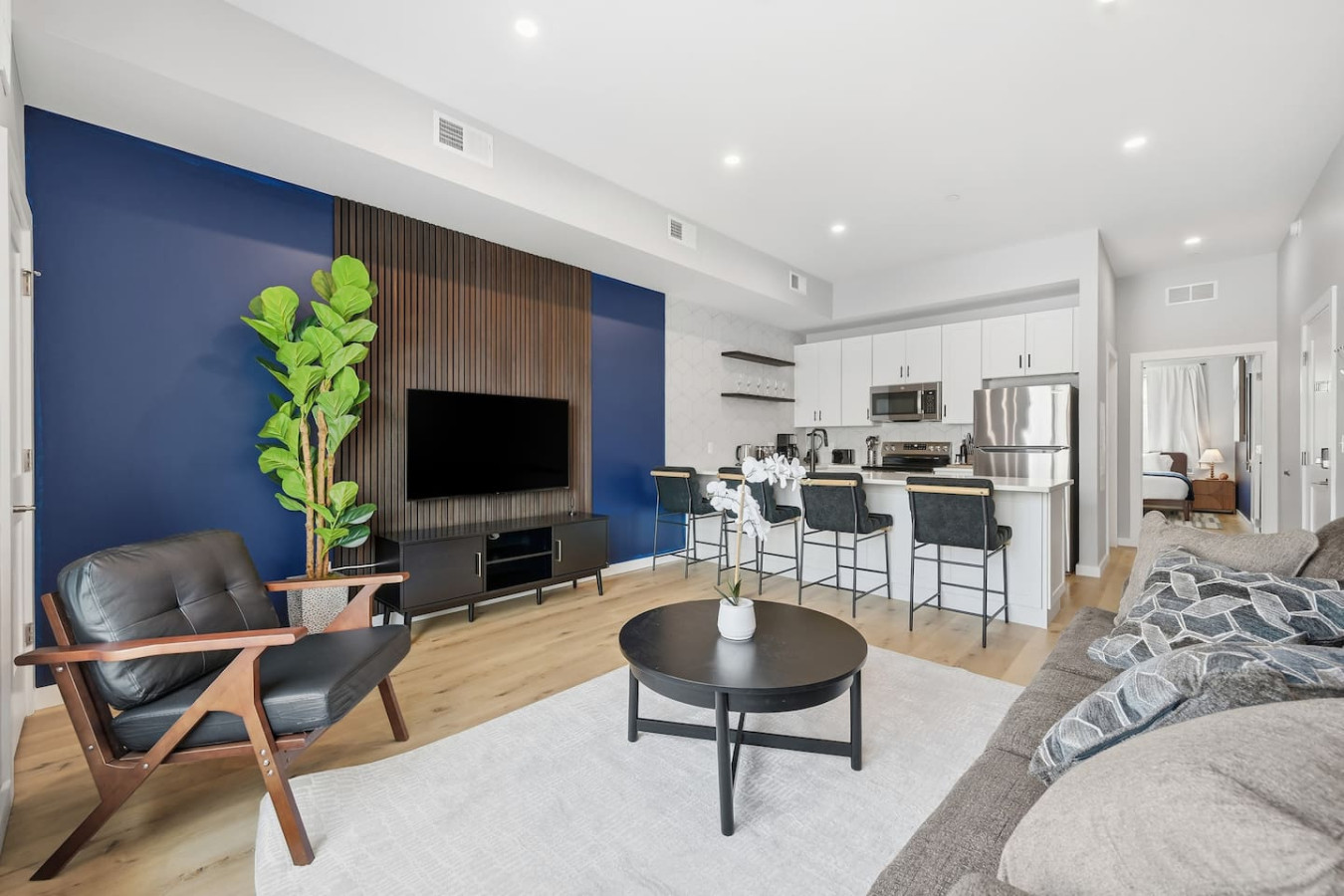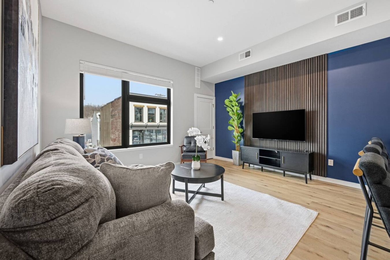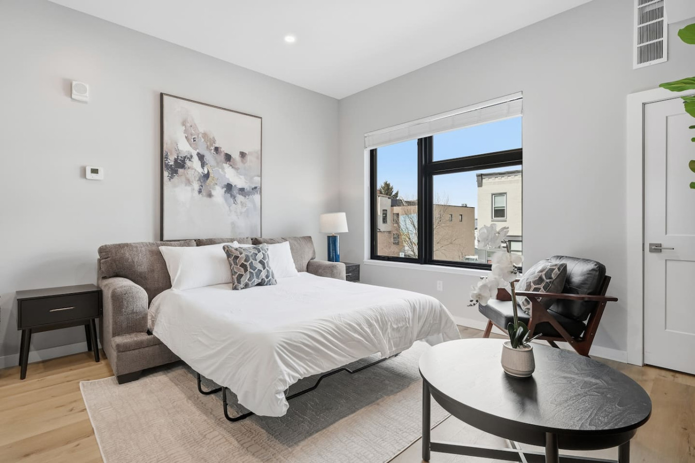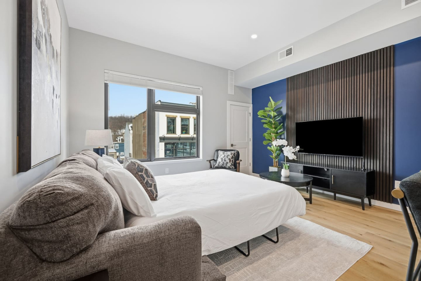 / nightEnjoy a stay in this brand new construction at The Madison on Penn, a boutique 8-unit building that is centrally located in Bloomfield. Just a short walk to UPMC Children’s Hospital and West Penn Hospital, this modern building is ideal for both short and extended stays. -1 King Bed (BR) -1 Queen Sleeper Sofa (LR) -Free off-street parking -Shared gym with sauna & exercise equipment -Free in-unit washer/ dryer -Desk with speedy wifi -24/7 guest support