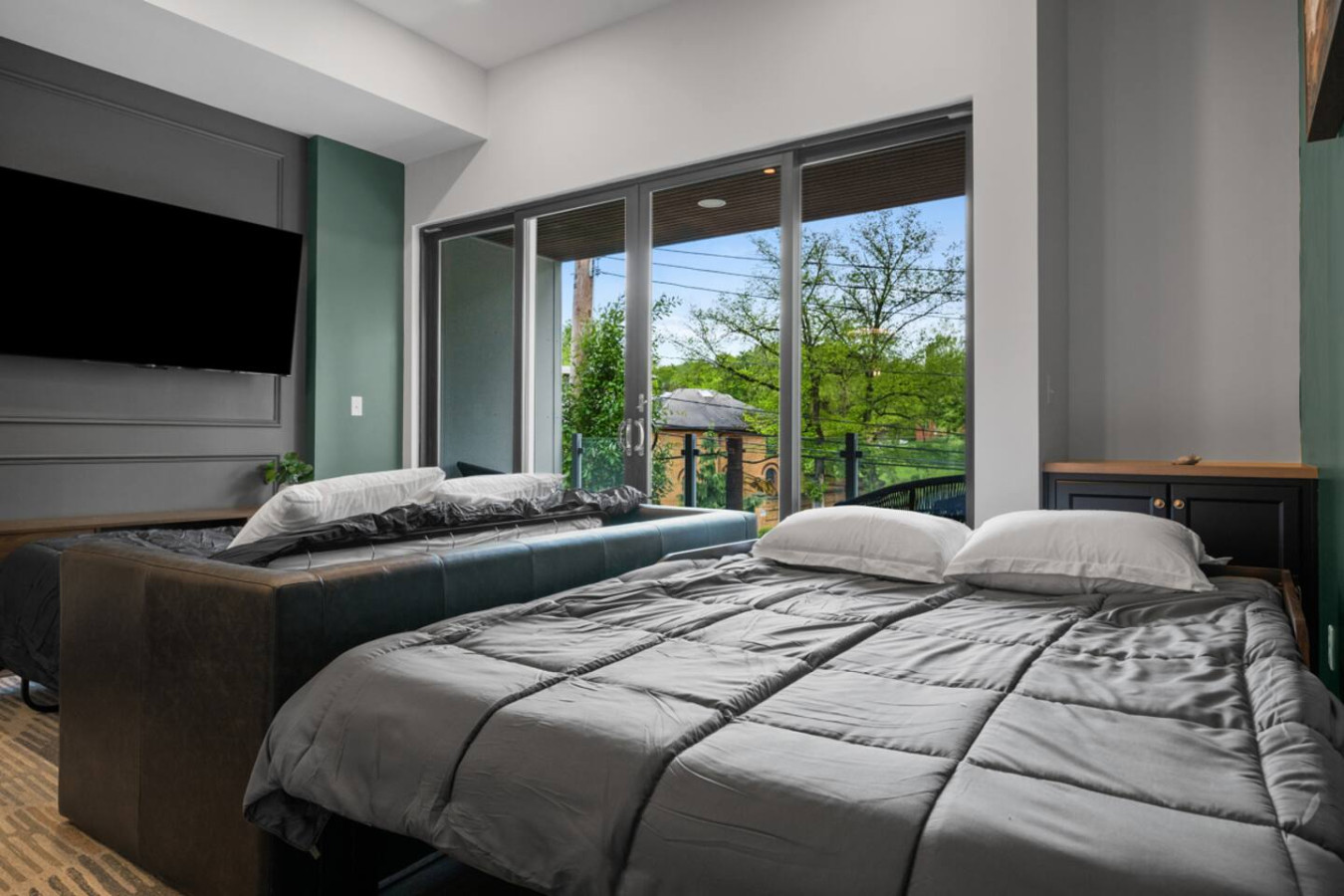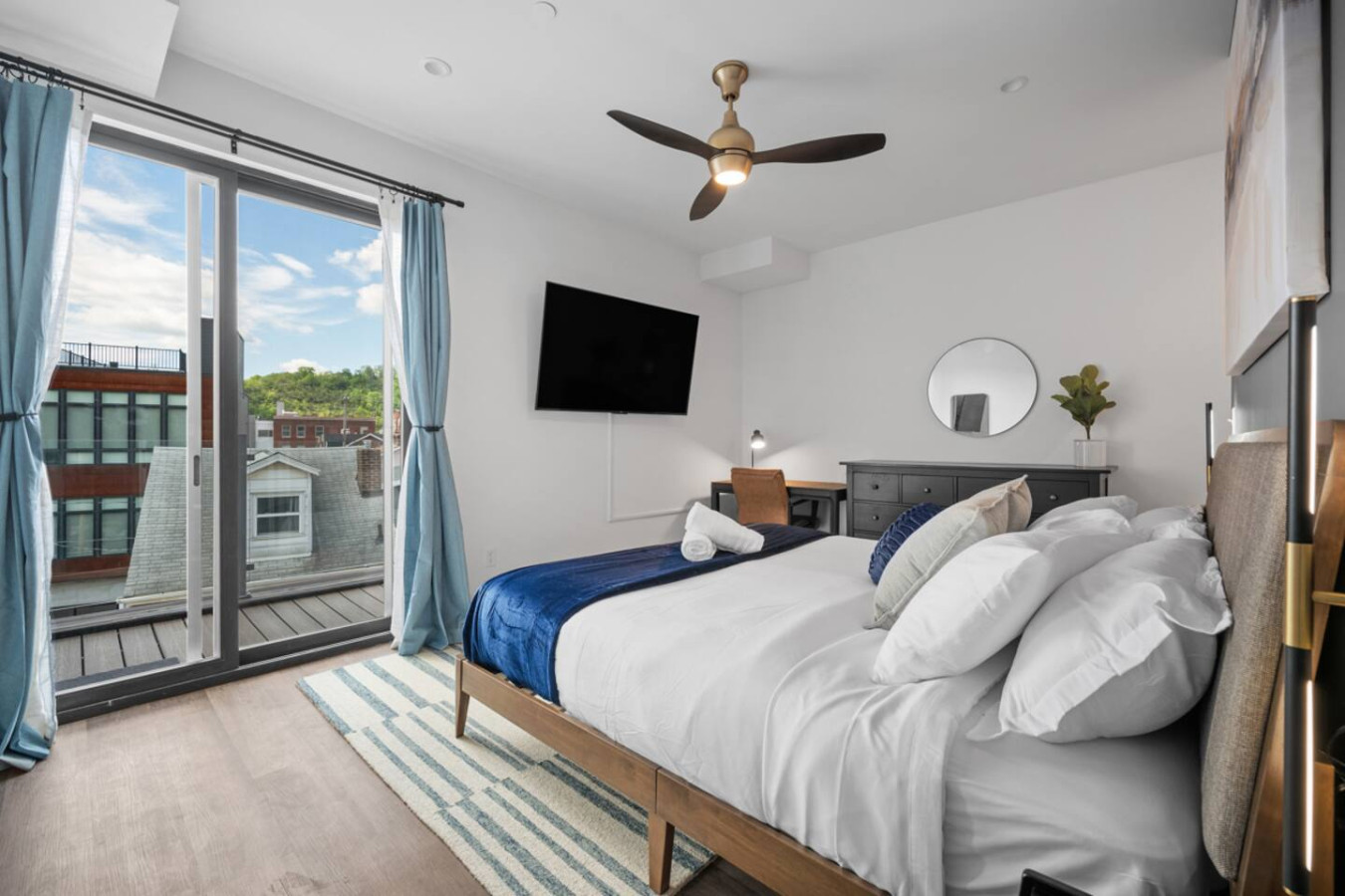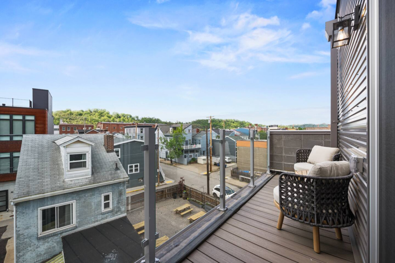 / nightEnjoy our stunning 2 BR Penthouse suite on Butler Street, right in the heart of Lawrenceville. This is a brand new construction building in 2025. Just steps away from several local shops, cafes, and dining options in one of Pittsburgh’s most vibrant neighborhoods. ⭐2 King Beds (memory foam mattresses) ⭐1 Queen Sleeper sofa + 1 Queen Murphy Bed + Pack N Play ⭐3 private decks (+ Rooftop Deck) ⭐Free in-unit washer/dryer ⭐Free off-street parking ⭐Desk with speedy wifi ⭐24/7 guest support Please note: This apartment is accessible only by stairs. You’ll need to climb two full flights, and there is no elevator in the building. Welcome to our immaculate 2-bedroom penthouse suite, nestled on lively Butler Street in the heart of Lawrenceville. This brand-new 2025 build combines stylish comfort with unbeatable location. Just steps from your door, discover local favorites like Parlor Dim Sum, The Abbey, and La Grassa Pizza. Enjoy a night out at Row House Cinema or Arsenal Bowl, or take in local culture at the Roberto Clemente Museum. Nearby landmarks like Allegheny Cemetery and Doughboy Square offer a glimpse into Pittsburgh’s storied past—all just minutes from your stay. Kitchen Area: As you step inside, you’ll be welcomed by a spacious open floor plan. Immediately to your left is a convenient half bathroom. Just ahead is the sleek, fully equipped kitchen featuring brand-new stainless steel appliances, ample countertop space, and plenty of cabinet storage. You’ll find everything you need for a comfortable stay, including a coffee maker, electric kettle, and toaster. A cozy 4-seater breakfast nook provides the perfect spot to enjoy your morning coffee or a relaxed meal. Dining Area: Right next to the kitchen is the dining area, featuring a comfortable 4-seater table—perfect for sharing meals with family or friends. It’s stocked with all the essentials, including dishes, utensils, and glassware, so you can enjoy home-cooked meals with ease. Living Area: The living area offers a cozy place to unwind, featuring a comfortable sofa that easily converts into a sleeper sofa, plus a plush armchair for relaxing. For added sleeping space, a hidden queen-sized Murphy bed folds down effortlessly. A large wall-mounted smart TV is positioned for easy viewing, making it the perfect spot to gather, rest, or enjoy a quiet evening. Step out from the living area onto the deck, where comfortable seating invites you to enjoy the sun or unwind with a cup of coffee. Let’s head upstairs to the next level of this stunning space! Laundry Room: As you step onto the second level of this stunning apartment, you’ll be greeted by the convenience of the laundry room, featuring an in-unit washer and dryer—perfect for keeping everything fresh during your stay. Bedroom 1: Upstairs, you’ll discover the first bedroom, a serene retreat featuring a king-sized bed with a plush memory foam mattress. Natural light pours in through a large glass window, filling the room with warmth and creating a cozy, elegant ambiance. Storage is plentiful, with a spacious closet and dresser to keep your belongings organized. The en suite bathroom elevates your experience, offering a stylish vanity with a large mirror, a luxurious showerhead, and a relaxing tub—complete with all the essentials for your comfort. Bedroom 2: At the end of the hallway, you’ll find the second bedroom, featuring a king-sized bed with a comfortable memory foam mattress. A big wall-mounted smart TV is positioned directly across from the bed, perfect for relaxing and enjoying your favorite shows. There’s plenty of storage with a spacious closet and dresser, plus a desk if you need to get some work or study done. The en suite bathroom offers a sleek standing shower with a premium showerhead, dual vanity sinks with mirrors, and all the essentials like shampoo, conditioner, and body wash. Step outside from the second bedroom to your own private deck, where you can unwind and enjoy the sun. Deck: Finally, let’s head upstairs to the stunning rooftop deck. Thoughtfully furnished with a stylish outdoor sofa, sun loungers, and comfortable chairs, it’s the perfect spot to relax, soak up the sun, and take in the beautiful views of Lawrenceville. Things to note: Pets: Pets are welcome for a small fee of $25 per pet/per stay. Washer/Dryer: Guests have access to a convenient in-unit washer and dryer, free of charge, making laundry a hassle-free part of your stay. Stairs: Please note, this apartment is only accessible by stairs—guests must climb two full flights to enter, as there is no elevator in the building. Inside the apartment, you’ll also need to climb one set of stairs to reach the bedrooms and another set to access the rooftop deck.