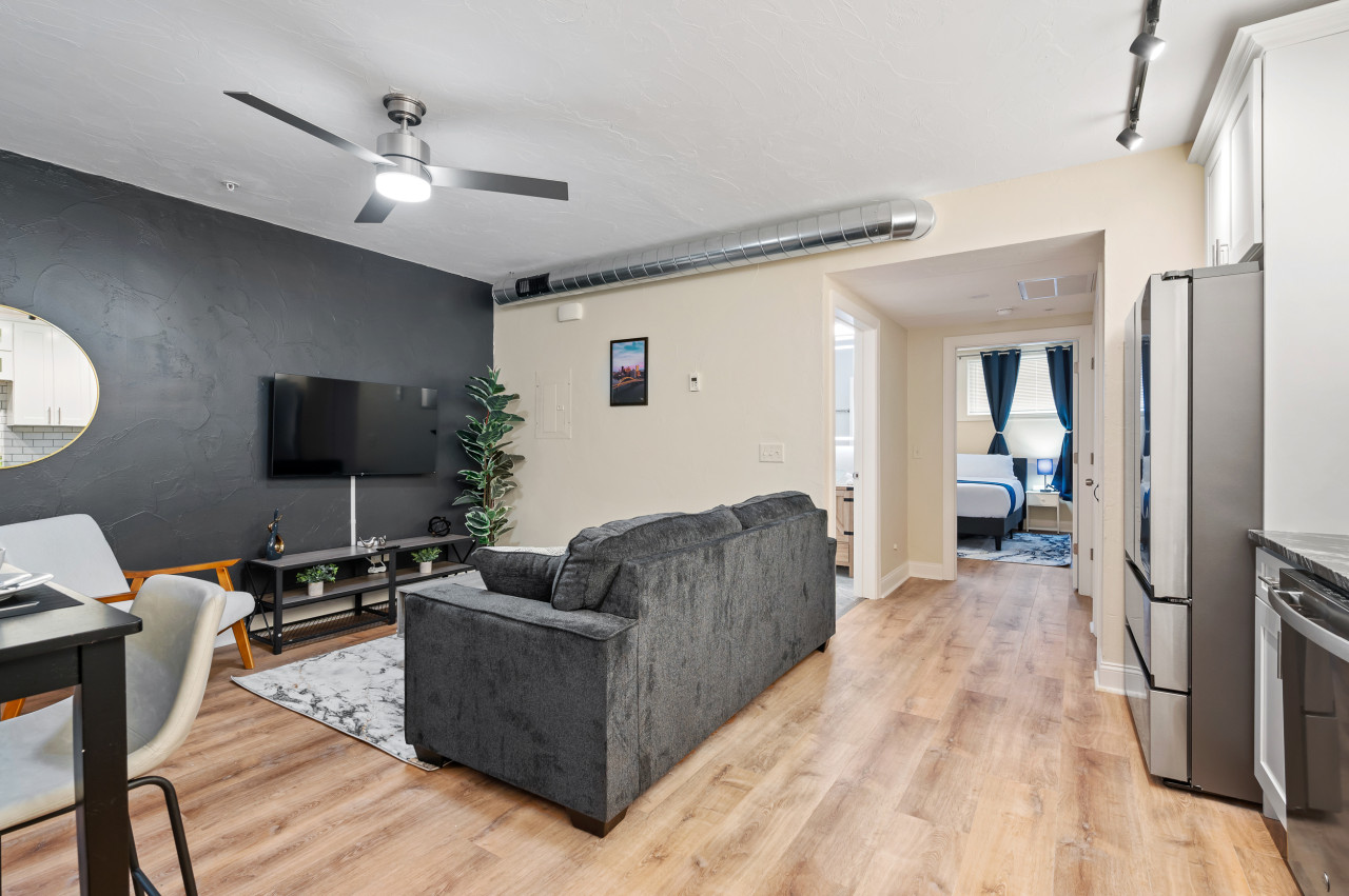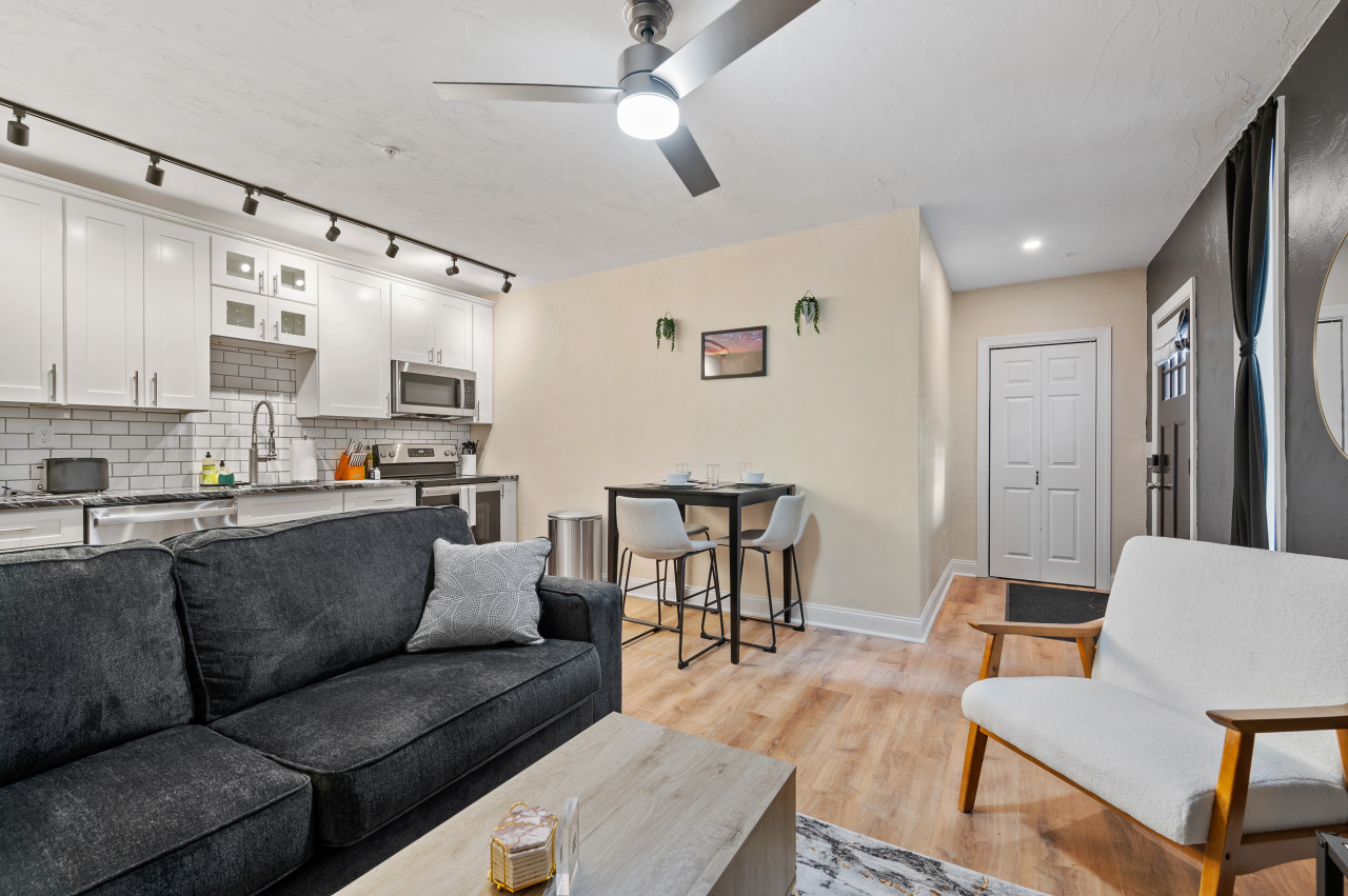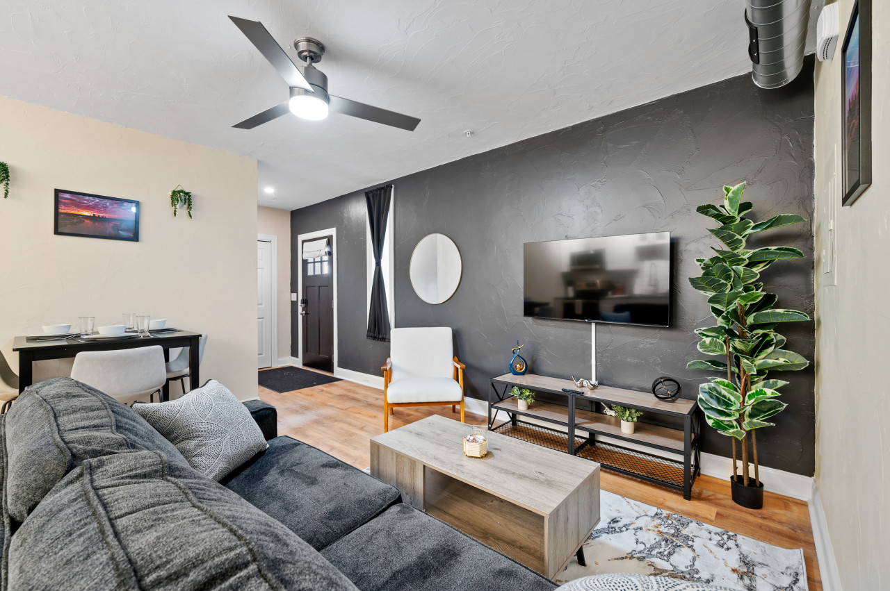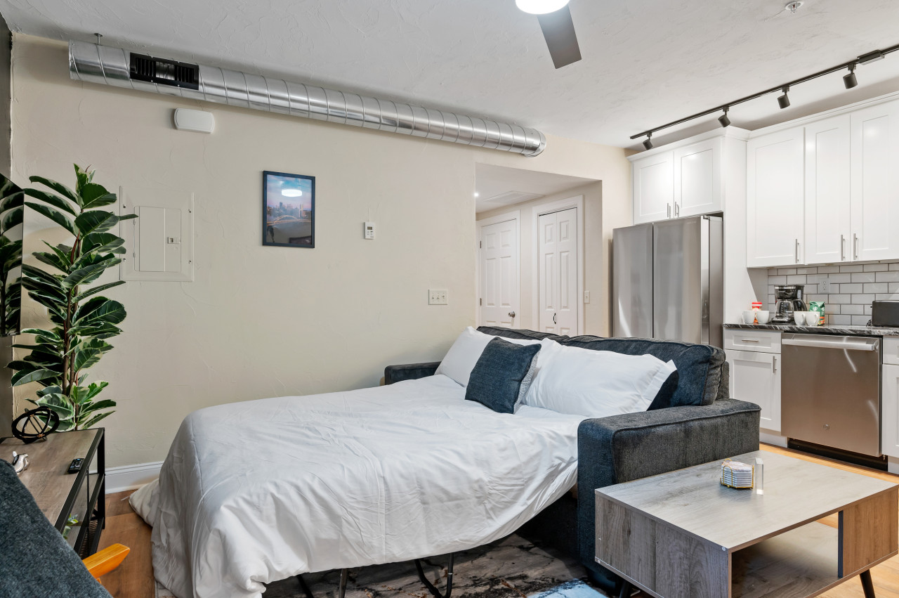 / nightEnjoy our spacious king-sized bed suite located in the safe, central Friendship neighborhood. This newly renovated retreat is just a short distance from all that Pittsburgh has to offer! Steps away from Whole Foods and short walk to Yinz Coffee shop! ⭐King bed (Memory foam mattress) ⭐Queen pull out bed ⭐Pack n play ⭐ADA Accessible! ⭐In-unit washer/ dryer ⭐Large desk w/ speedy wifi & extra monitor ⭐Pet friendly ⭐24/7 Guest support ⭐Free off-street parking ⭐Close to CMU/ Pitt! ⭐$0 cleaning fee! Conveniently located near Pittsburgh's prestigious hospitals: UPMC Shadyside: Just 0.9 miles away, a quick 5-minute drive. West Penn: Only 1.0 miles away, a brief 4-minute drive. Children's Hospital: Just 1.4 miles away, a short 6-minute drive. Step into our welcoming 1-bedroom suite, perfectly situated in the lively Friendship/Shadyside neighborhood, blending contemporary comfort with ultimate convenience. Recently refurbished and ADA accessible, this expansive sanctuary grants effortless exploration of Pittsburgh's highlights. Enjoy the convenience of Shadyside, just a mere 0.7 miles away, offering a delightful 13-minute walk or a brief 3-minute drive. Experience the vibrant allure of Downtown Pittsburgh with a swift 14-minute drive from our location. Located conveniently on the first floor of the apartment complex for easy access, this bright 1-bedroom haven welcomes you with modern comfort and effortless relaxation. Accessible via a smart lock on the front door, stepping into this first-floor apartment is a breeze. Living Area: Step into our cozy living area, where comfort and entertainment blend seamlessly. You'll love the spacious layout, perfect for relaxing or socializing. The plush sofa easily converts into a queen-sized sleeper, ideal for extra guests. Watch your favorite shows on the 50" HDTV with Roku access to a variety of streaming options. It's the perfect place to unwind and make the most of your stay. Kitchen and Dining Area: This kitchen is stocked with all the necessary appliances for your cooking convenience, including a fridge, dishwasher, electric stove, microwave, hot water kettle, toaster, and blender. You'll also find a dining table perfect for enjoying your meals. All essential cooking utensils, pots, pans, as well as a complete set of dining essentials like plates, cups, bowls, and coffee mugs, are provided for your culinary adventures. Bathroom: Next to the living room, our bathroom is equipped with everything you need, from a hairdryer to body soap, shampoo, conditioner, toilet paper, hand towels, and bath towels. You'll find a spacious standing shower area with a luxurious shower head, perfect for rejuvenating yourself after a day of exploring Pittsburgh's delightful offerings. Bedroom: Next to the bathroom is a well-lit and tidy bedroom featuring a luxurious king-sized bed. The mattress is a Nectar memory foam, known for its exceptional comfort. Ample storage space is provided with closets and a dresser for your belongings. A smart TV offers entertainment options before bedtime, while a sizable mirror allows for a quick glance before stepping out. Additionally, a spacious desk awaits, perfect for work or study sessions, and a monitor is available to enhance productivity by connecting your devices. Things to note: Steps: The apartment is located on the first floor of the apartment complex. The apartment is fully ADA accessible. Washer/Dryer: Guests have access to a convenient in-unit washer and dryer, free of charge. Pet Friendly: The apartment is pet friendly. However, we do require a $20 fee per pet. Internet/WIFI Connection: Ultra-fast 940mbps of internet connection. A/C and Heating: Central AC and heating is available in the apartment which can be controlled via thermostat. Parking: There's a full parking lot across the street. Additional street parking is available for extra cars, each unit is allocated one spot in the lot. For street parking, you'll need to register your vehicle for permit parking, but don't worry, registration is simple and included in our check-in instructions.