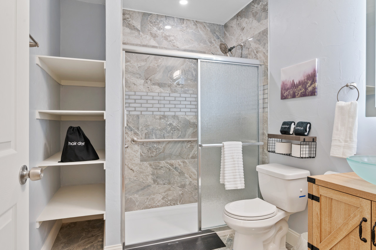 October 2025 5.00Clean and comfortable. Didn't love that there are no windows in the living area to let natural light in or see out of, but we were only sleeping there so it worked. Would have liked to have some measuring cups and spoons, pyrex measuring cup in the kitchen because we like to have breakfast in. Note that the bathroom tiled floor and the shower floor are very slippery! Grab bars are also slippery if you have soapy hands. Host is very helpful, responsive and friendly.